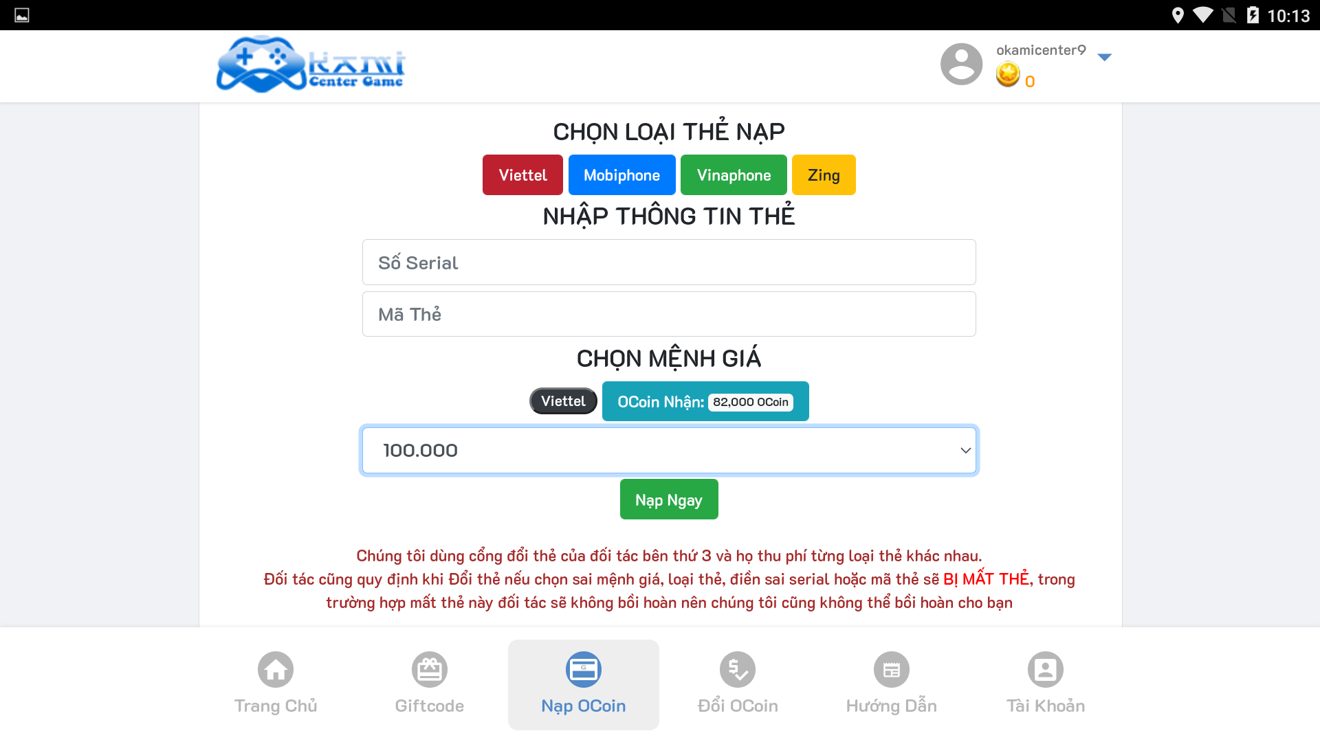 -Chọn đúng loại thẻ và mệnh giá. Nhập đúng seri và mã thẻ để nhận OCoin. Tùy theo loại thẻ bị trừ chiết khấu sẽ nhận OCoin giá trị khác nhau.