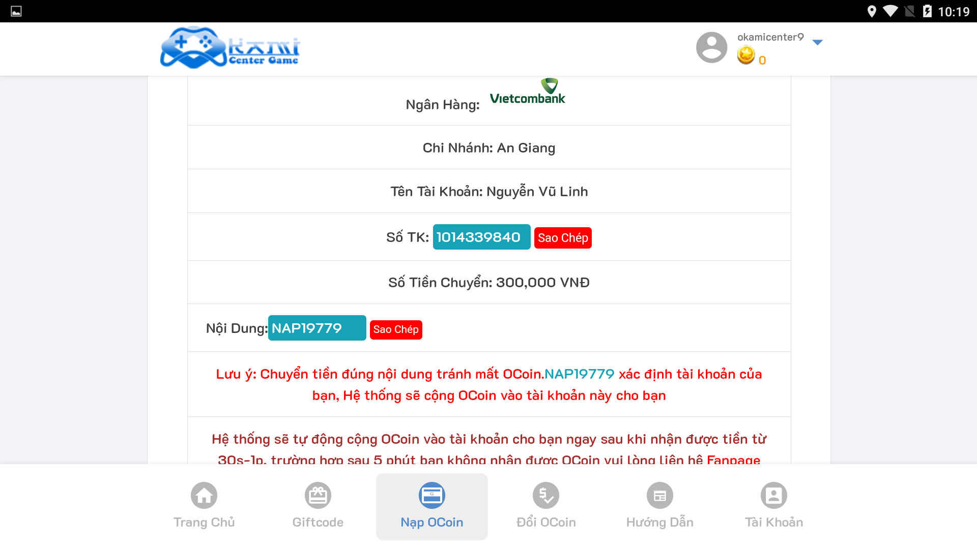 -Thực hiện chuyển tiền đến ngân hàng Vietcombank số tài khoản 1014339840 nhập số tiền muốn nạp và nhập dúng mã giao dịch (NAP19779) để xác định tài khoản của bạn. Hệ thống sẽ tự động cộng OCoin vào tài khoản cho bạn ngay sau khi nhận được tiền từ 30s-1p.