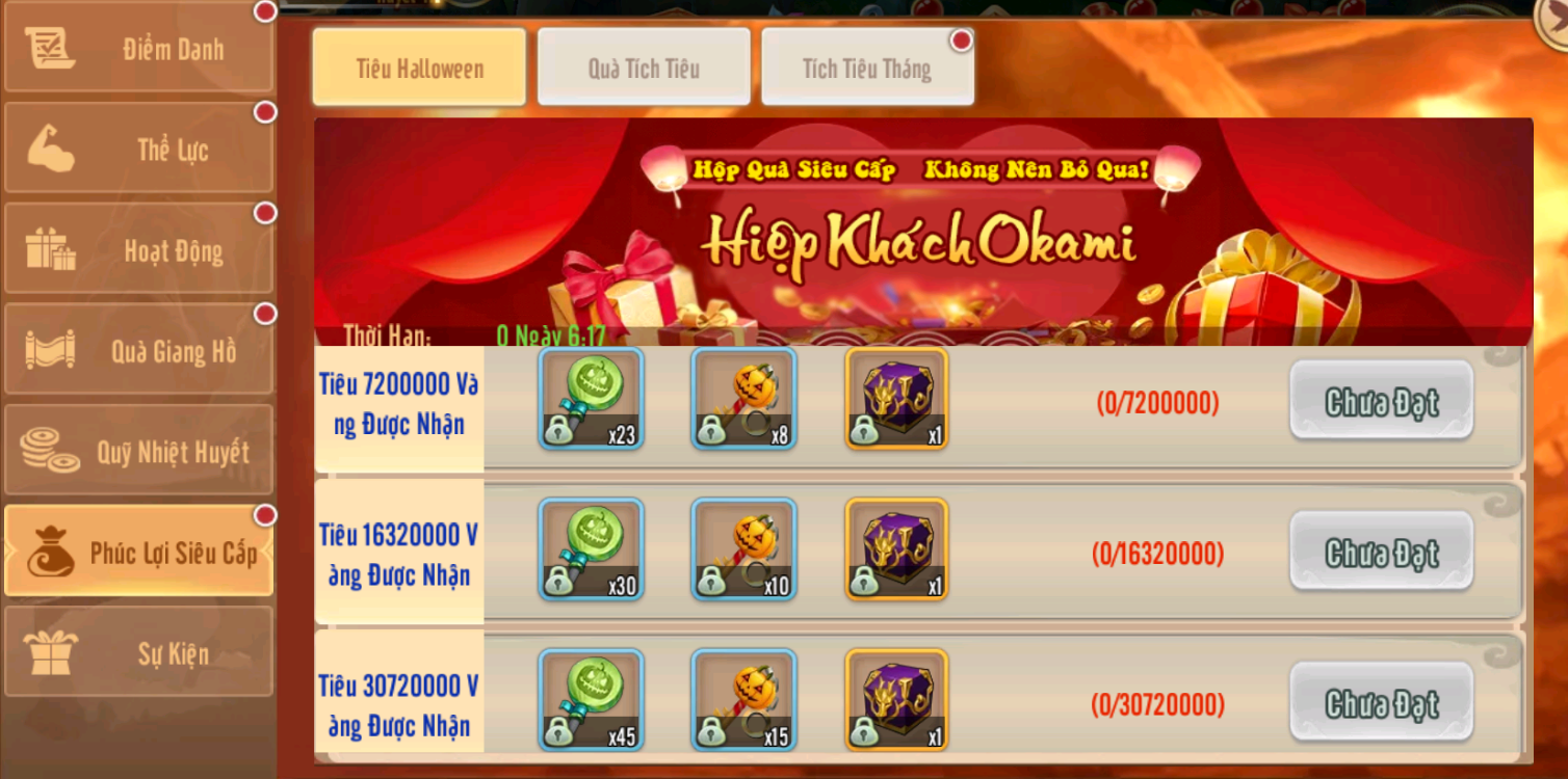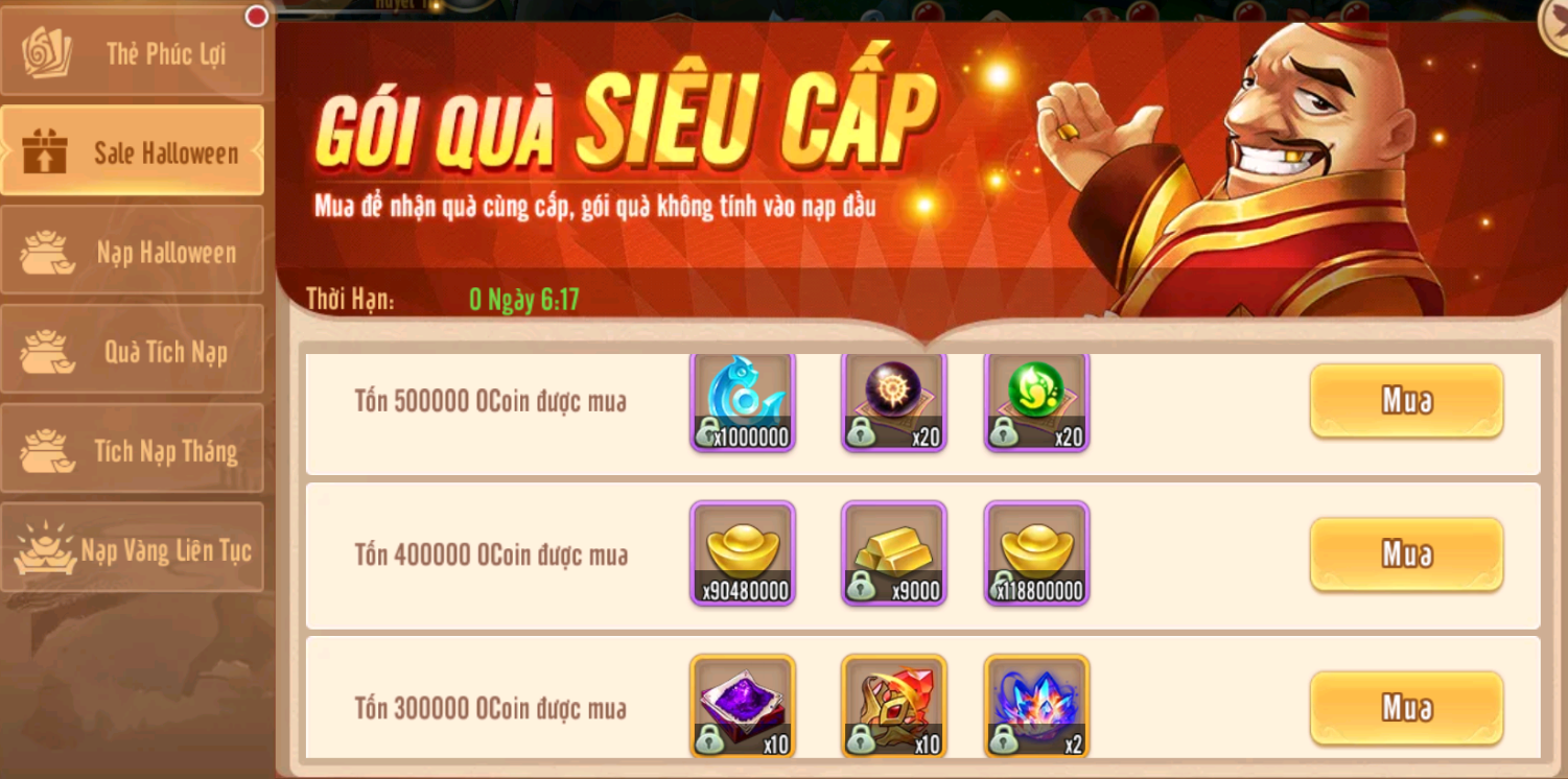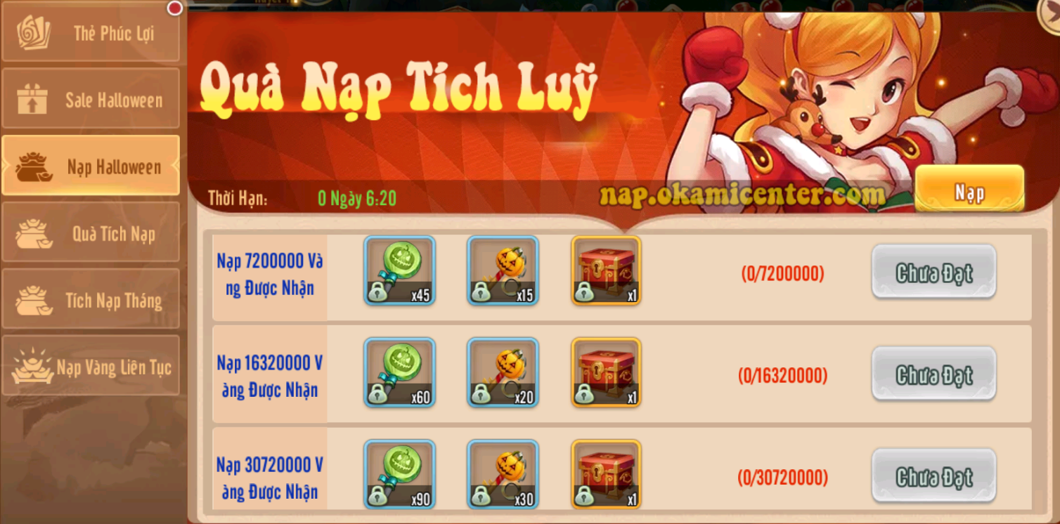 1.Sự kiện tích Nạp: nạp vàng là có quà,quà nạp được làm mới mỗi ngày từ 31/10 đến 2/11