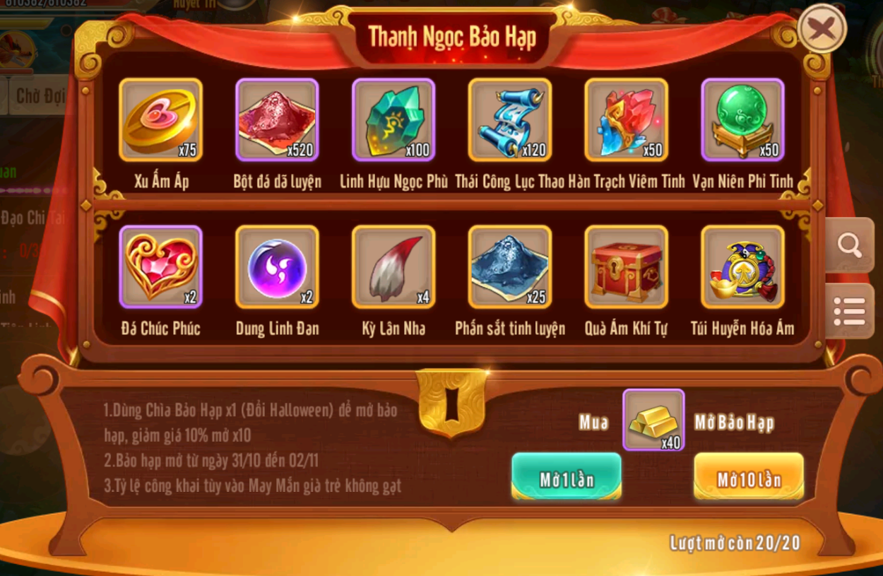 6.Sự kiện Thanh Ngọc Bảo Hạp sử dụng Chìa Bảo Hạp để mở bảo hạp, bảo hạp được quay 20 lần diễn ra từ 31/10 đến 2/11, Chìa Bảo Hạp đổi tại sự kiện Đổi Halloween