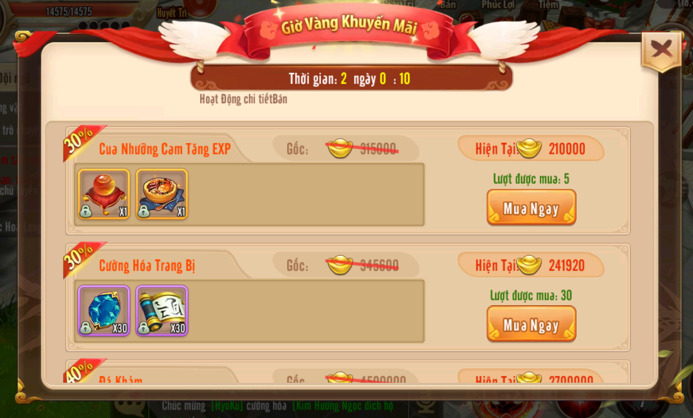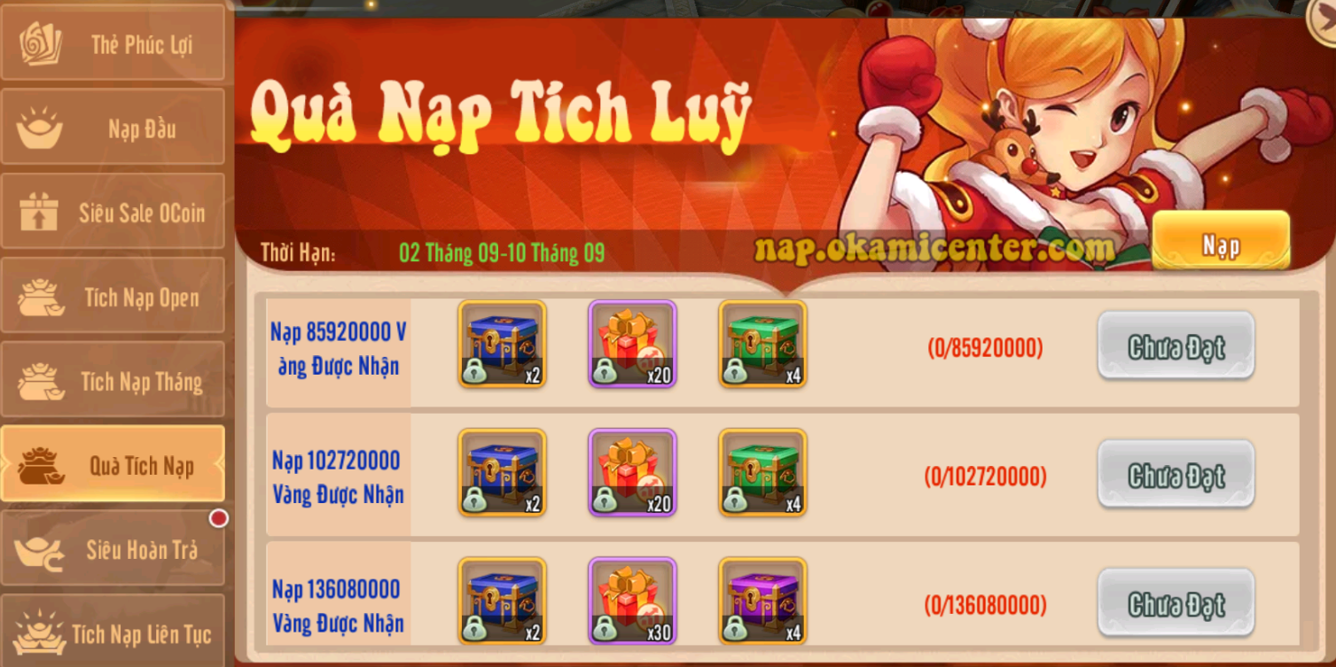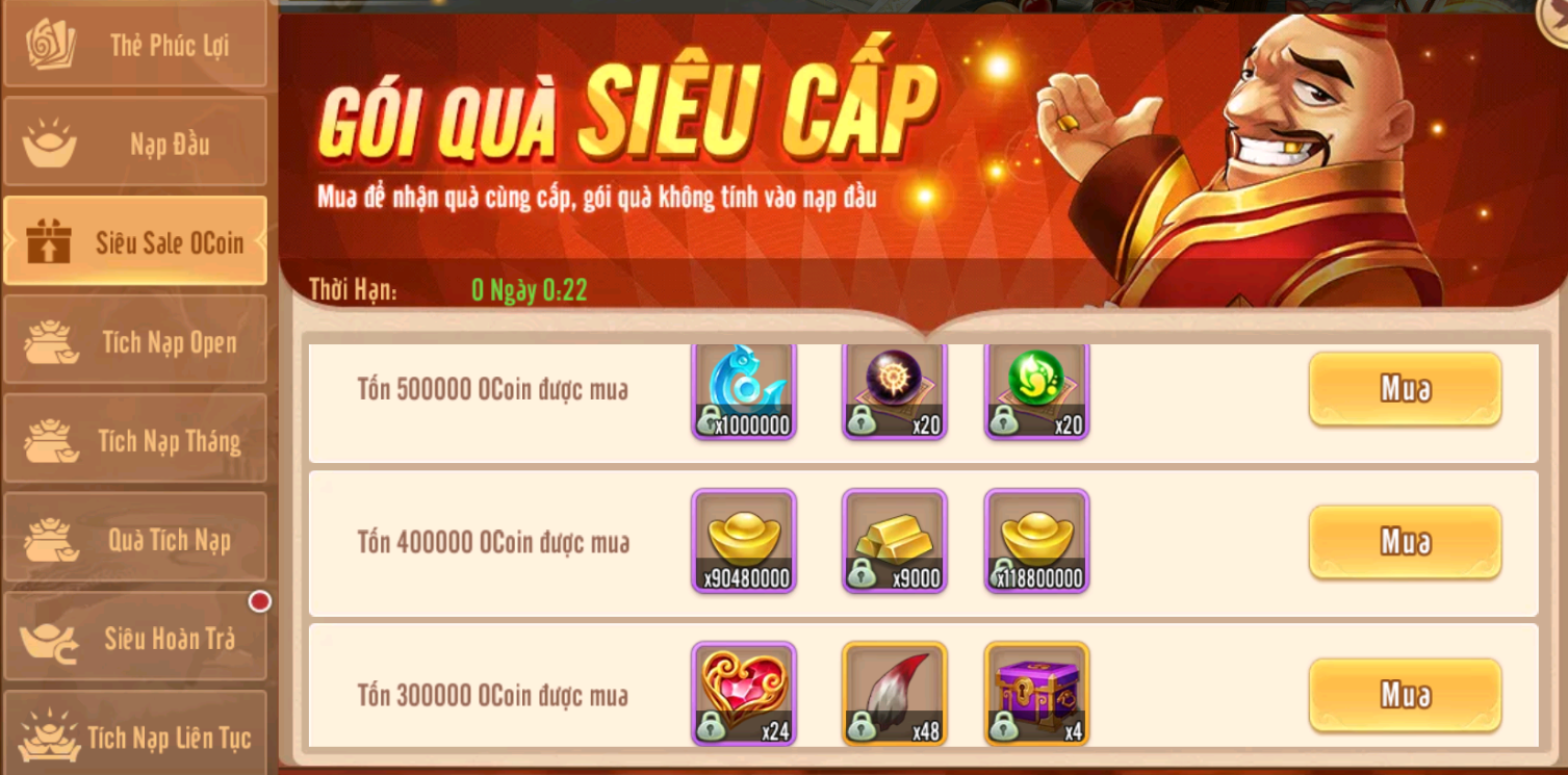 Sự Kiện Quà Siêu Hiếm Khuyến Mãi Các Gói Quà Hot mỗi ngày từ 02/09 đến 08/09. Lưu ý mua gói quà bằng OCoin không tích lũy vào sự kiện nạp vàng, được tích nạp tri ân vip.