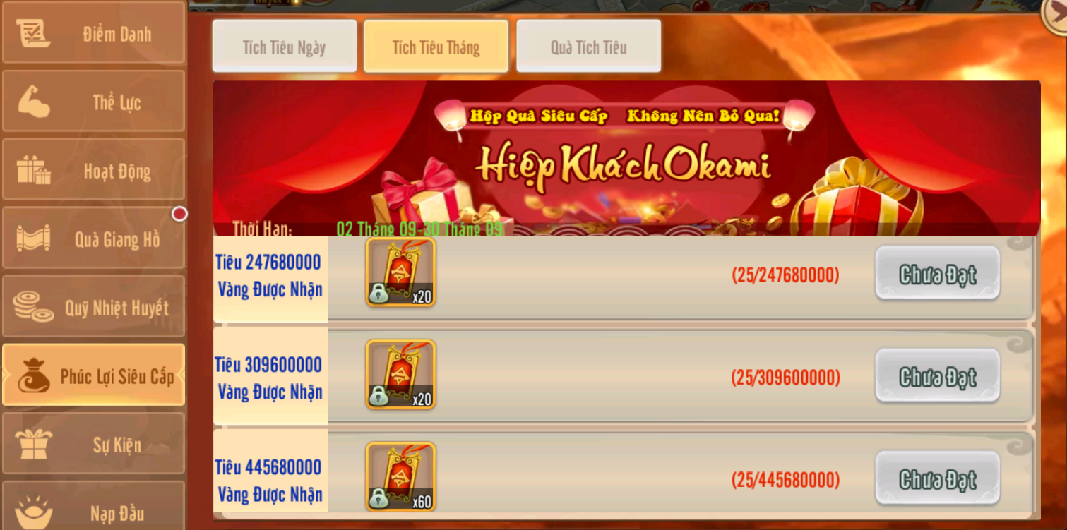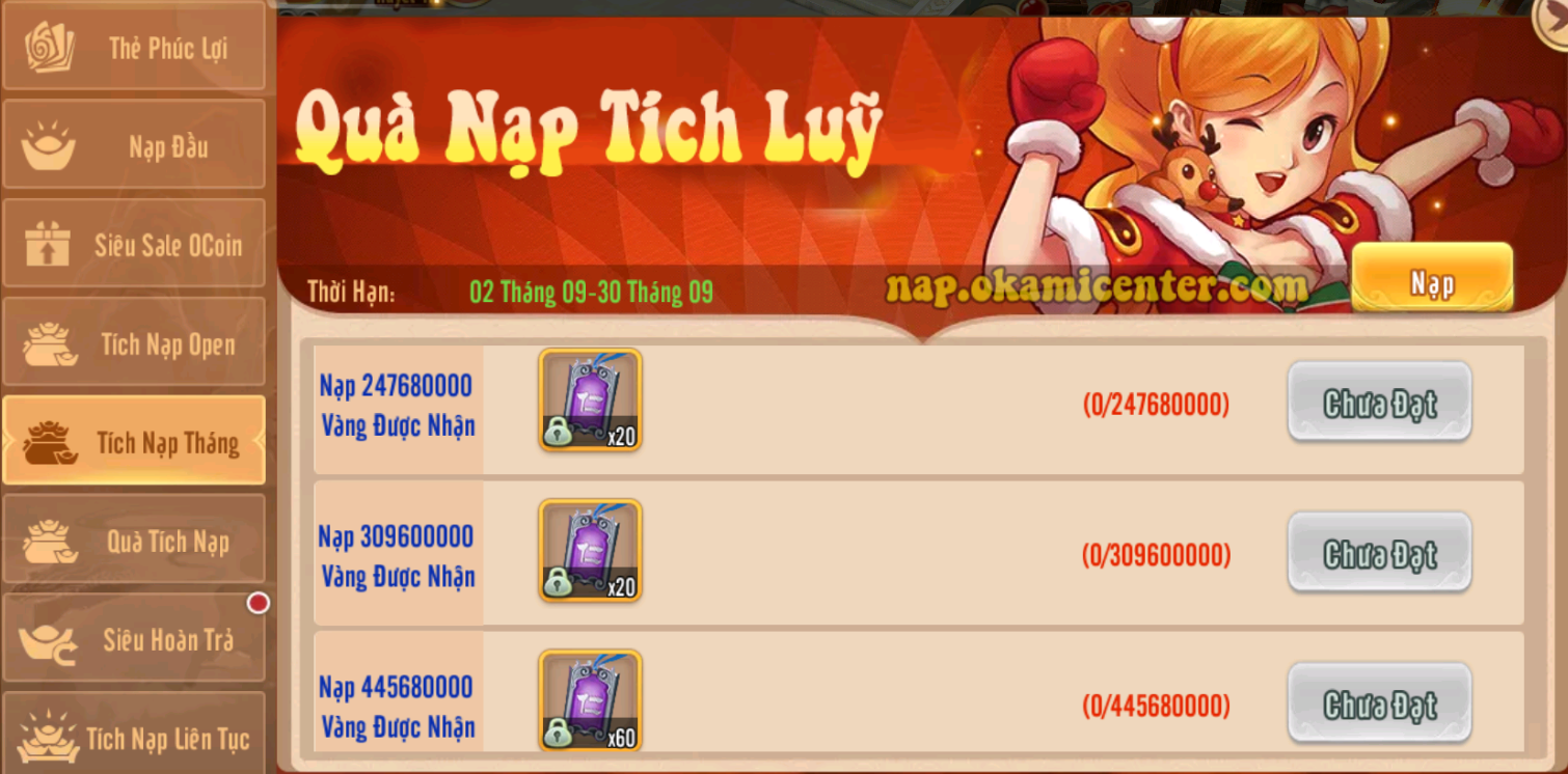 Quà Tích Nạp Tháng nhận Nhân Vương Lệnh từ 01/09 đến 30/09, các mốc nạp được cộg dồn.