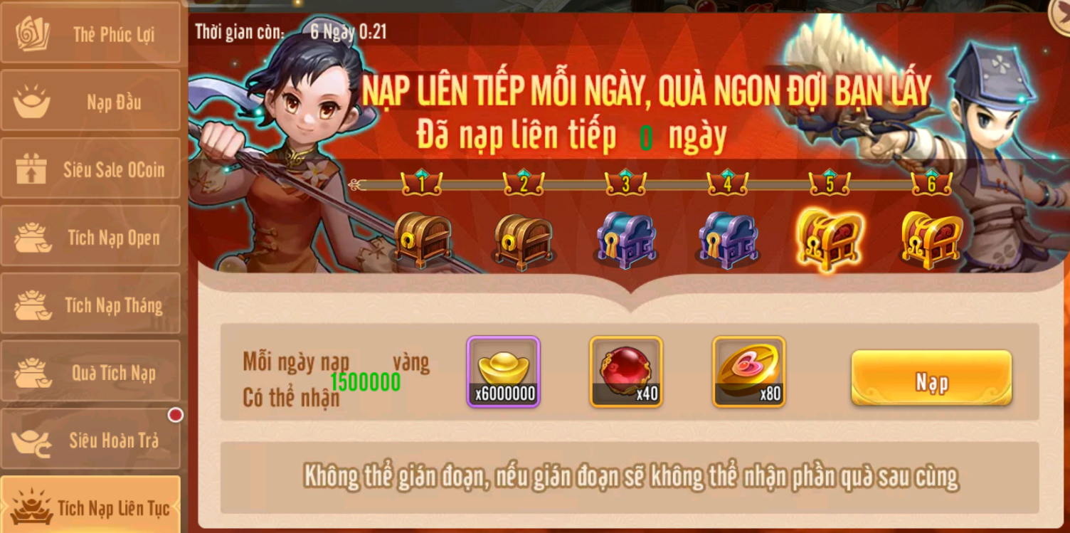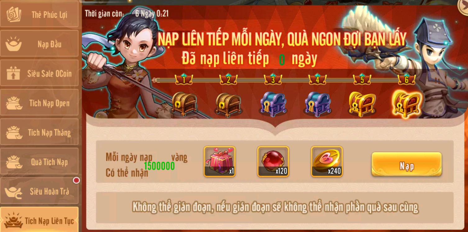 Quà Nạp Liên Tục chỉ cần nạp 25K mỗi ngày nhận thêm Vàng x6.000.000 từ 02/09 đến 08/09