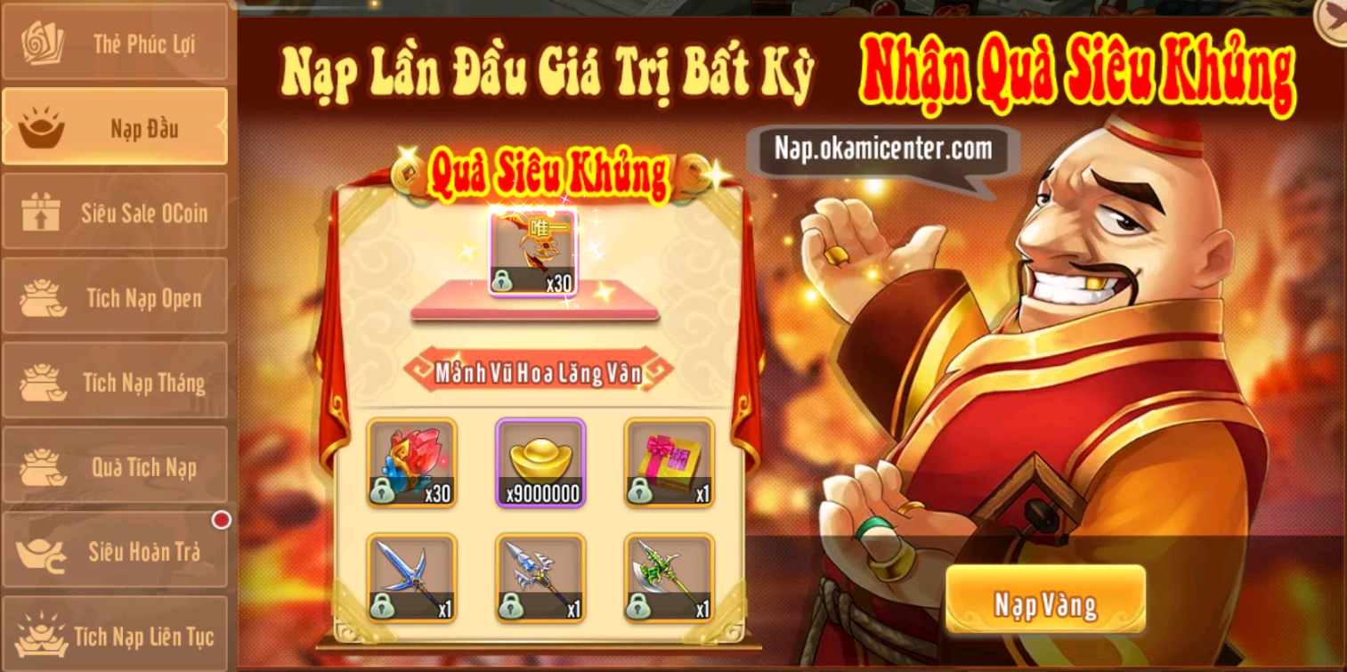 Khuyến Mãi Nạp Đầu chỉ cần 25K tặng Quà Siêu Khủng: Mảnh Vũ Hoa Lăng Vân x30, Vàng x9.000.000, Vũ Khí Cam 3x-5x-6x, Cua Nhưỡng Cam x393 (9.432.000.000 EXP)