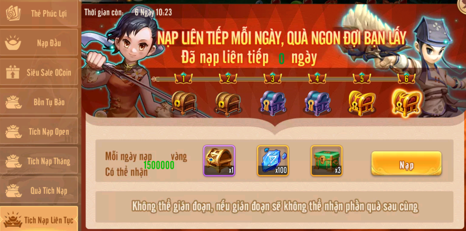 Khuyến Mãi Nạp Đầu chỉ cần 25K tặng Quà Siêu Khủng: Cua Nhưỡng Cam *393 (9.432.000.000 EXP), Vàng *9.000.000, Nhẫn Càn Khôn Vi Đại Bảo *1, Dây Kim Hương Ngọc*1, Tay Kim Hương Ngọc*1, Giày Kim Hương Ngọc*1, Vũ Khí Truyền Thế Đao Kiếm Tiếu *1, Tẩy Tủy Đan *2880, Đá Tẩy Luyện *1440, Quà Xu Nạp Đầu *20