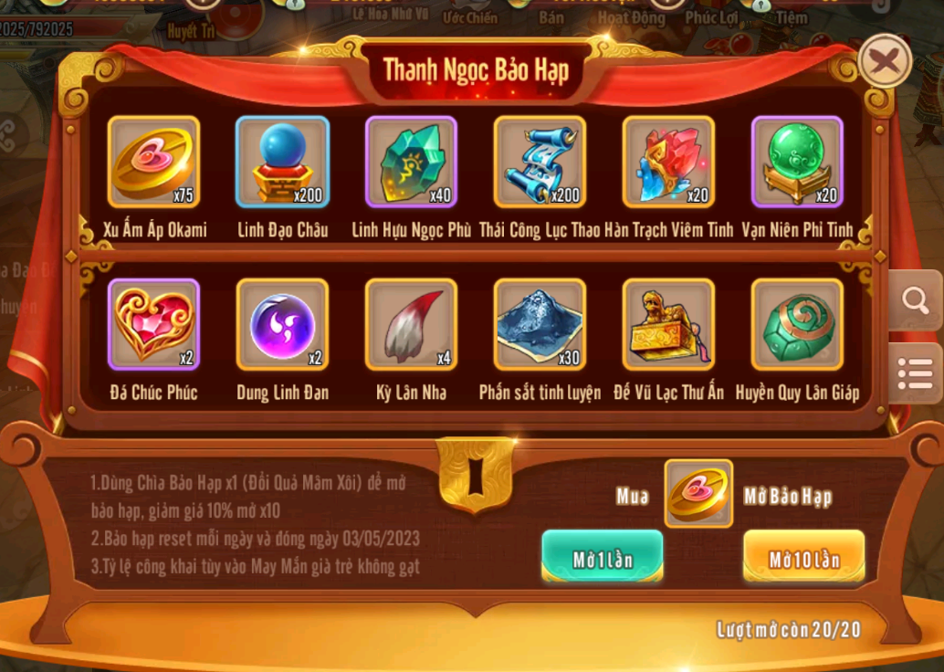 3.Sự kiện Thanh Ngọc Bảo Hạp sử dụng Chìa Bảo Hạp để mở bảo hạp, bảo hạp diễn ra từ 01/05 đến 03/05 mỗi ngày được quay 20 lần