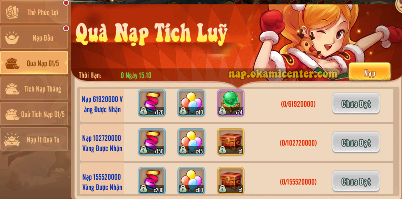 1.Sự kiện tích Nạp: nạp vàng là có quà,quà nạp được làm mới mỗi ngày từ 01/5 đến 03/05
