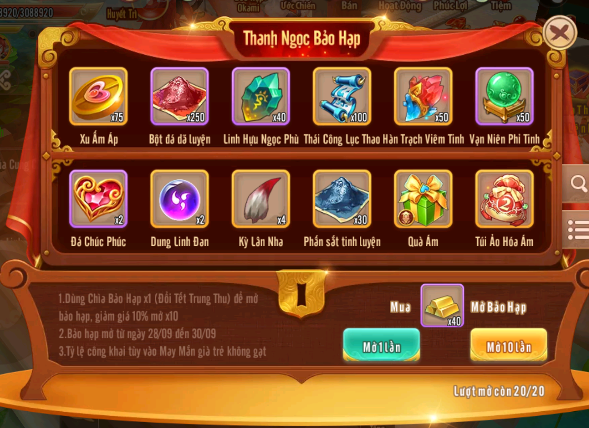 7.Sự kiện Thanh Ngọc Bảo Hạp sử dụng Chìa Bảo Hạp để mở bảo hạp, bảo hạp được quay 20 lần diễn ra từ 28/9 đến 30/9, Chìa Bảo Hạp đổi tại sự kiện Đổi Tết Trung Thu
