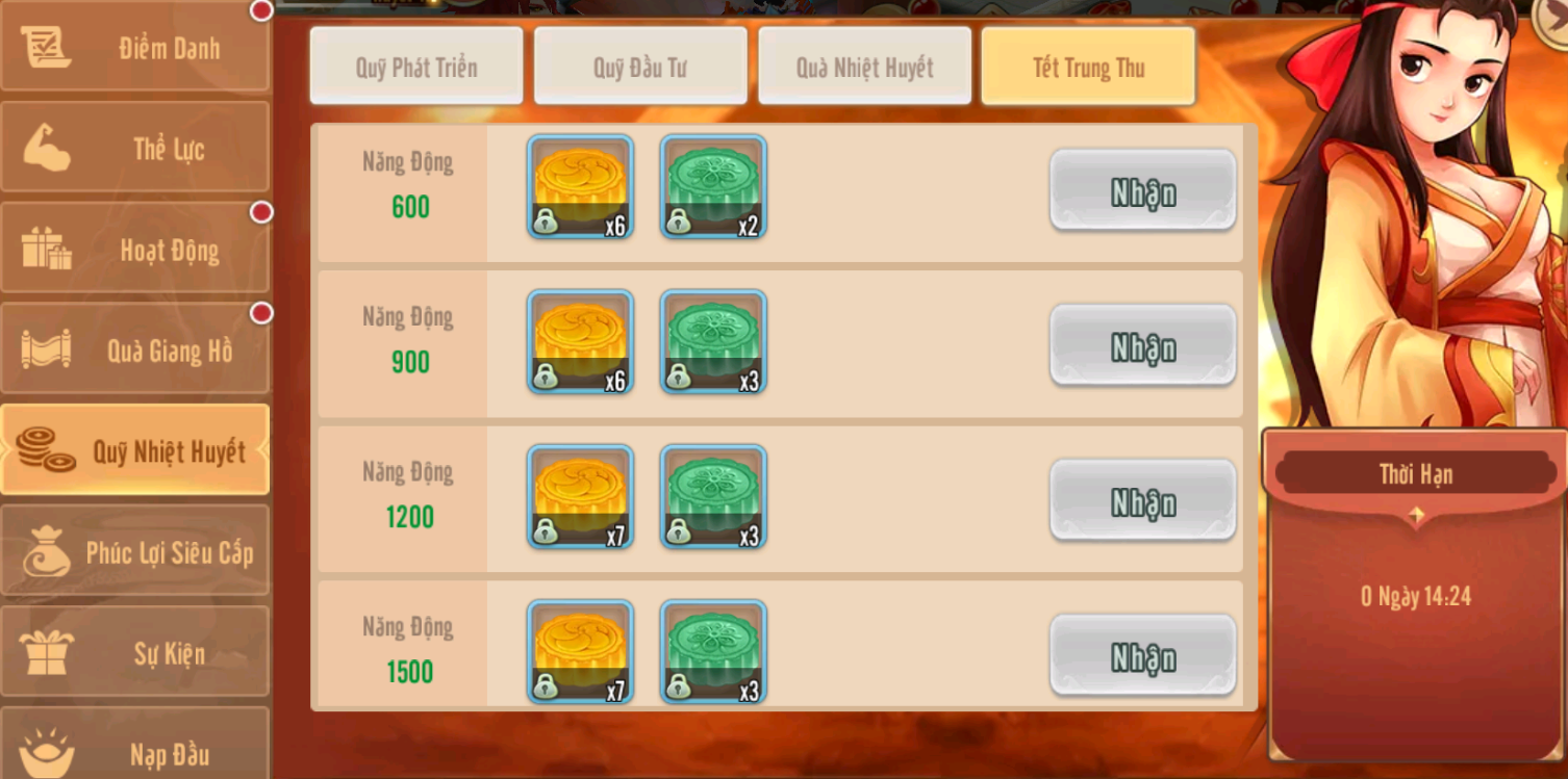 5.Sự kiện Tết Trung Thu tham gia các hoạt động ingame tích lũy năng động nhận vật phẩm đổi quà từ 5h 28/9 đến 5h 1/10 (làm mới mỗi 24h)