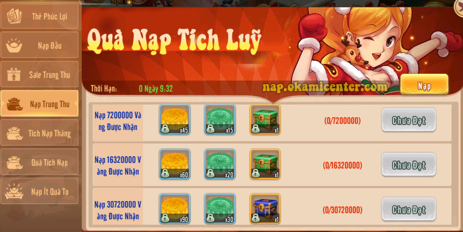 1.Sự kiện tích Nạp: nạp vàng là có quà,quà nạp được làm mới mỗi ngày từ 28/9 đến 30/9
